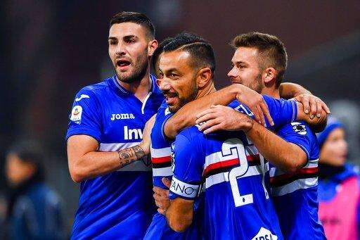 Sampdoria's Fabio Quagliarella, centre, jubilates with his teammates after scoring the goal against Sampdoria during their Italian Serie A soccer match between Sampdoria and Bologna at the Luigi Ferraris stadium in Genoa, Italy, Saturday, Dec. 1, 2018. (Simone Arveda/ANSA via AP) The Associated Press