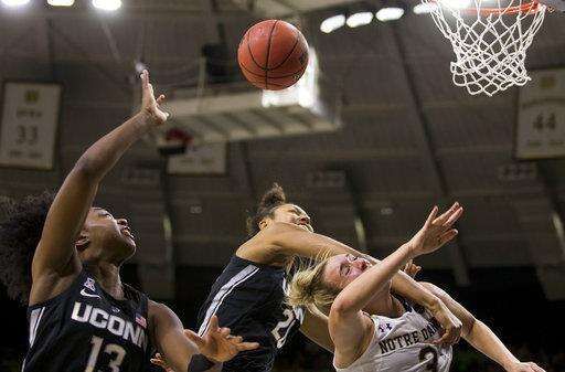 Connecticut's Olivia Nelson-Ododa (20) blocks a shot by Notre Dame's Marina Mabrey (3) next to Connecticut's Christyn Williams (13) during the second half of an NCAA college basketball game Sunday, Dec. 2, 2018, in South Bend, Ind. (AP Photo/Robert Franklin) The Associated Press