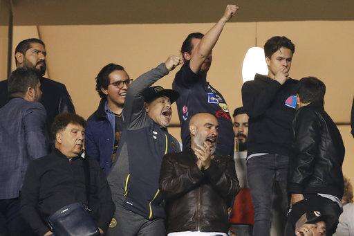 Dorados head coach Diego Maradona, center, shouts against Atletico San Luis' fans during the final leg of Mexico's second division soccer league in San Luis Potosi, Mexico, Sunday, Dec. 2, 2018. Atletico San Luis beat Dorados 4-2 in the match, giving the aggregate series a 4-3 and is the champion of the Mexican second division(AP Photo/Eduardo Verdugo)