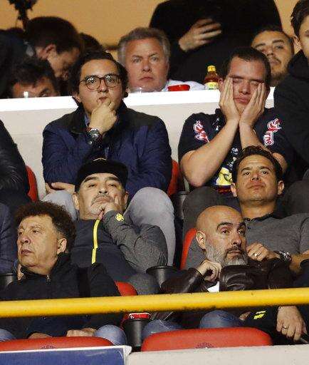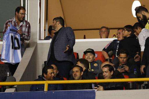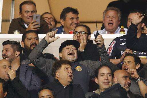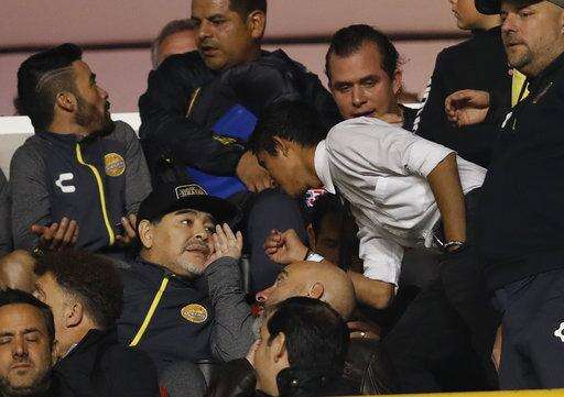 Maradona used a walkie-talkie while watching the final from the stands because he'd been banned from the touchline during the first leg for arguing. Local media on Monday published videos of an infuriated Maradona hurling unprintable Mexican and Argentine insults, and trying to punch someone apparently while leaving the stadium in the north-central city of San Luis Potosi.