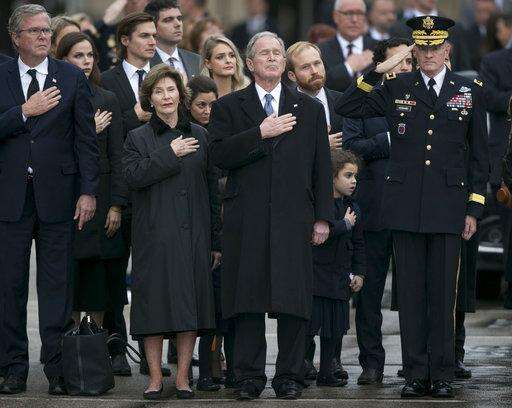Former President George W. Bush, middle, with former first lady Laura Bush, covers his heart as the casket of his father, former President George H.W. Bush, is moved from a presidential funeral train to a hearse at Texas A&M University in College Station, Texas, for burial at the George Bush Presidential Library on Thursday, Dec. 6, 2018. (Jay Janner/Austin American-Statesman via AP) The Associated Press