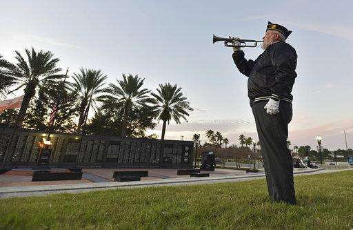 Beaches Honor Guard bugler John Poe plays Taps in honor of former President George H.W. Bush on the day of his funeral Thursday, Dec. 6, 2018 at the Veteran's Memorial Wall at TIAA Bank Field in Jacksonville, Fla. Hundreds of buglers across the country played Taps at the time of his internment. (Will Dickey/The Florida Times-Union via AP) The Associated Press