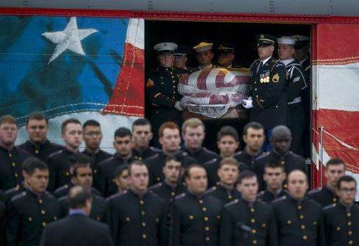 A joint military honor guard carries the casket of former President George H.W. Bush after it arrived by a presidential funeral train at Texas A&M University in College Station for burial at the George Bush Presidential Library on Thursday, Dec. 6, 2018. (Jay Janner/Austin American-Statesman via AP) The Associated Press