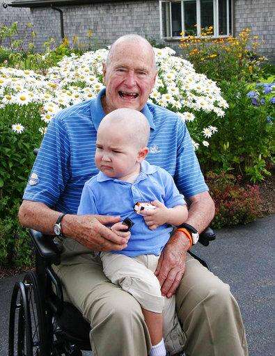 FILE - In this July 24, 2013, file photo provided by the Office of George Bush, former President George H. W. Bush poses with Patrick (last name withheld at family's request), 2, in Kennebunkport, Maine. Bush joined members of his Secret Service detail in shaving his head to show solidarity for Patrick, who is the son of one of the agents. The child is undergoing treatment for leukemia and is losing his hair as a result. Bush was a humanitarian and made volunteerism a hallmark of his presidency from 1989 to 1993. (Barbara Bush/Office of George Bush via AP, File) The Associated Press