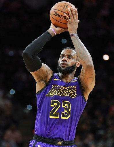 Los Angeles Lakers' LeBron James shoots during the first half of the team's NBA basketball game against the San Antonio Spurs, Friday, Dec. 7, 2018, in San Antonio. (AP Photo/Darren Abate) The Associated Press