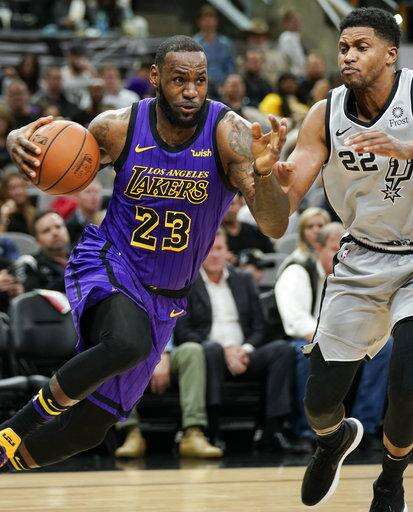 Los Angeles Lakers' LeBron James (23) drives around San Antonio Spurs' Rudy Gay during the first half of an NBA basketball game Friday, Dec. 7, 2018, in San Antonio. (AP Photo/Darren Abate) The Associated Press