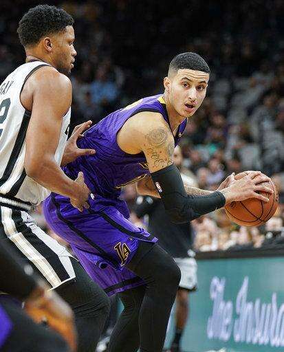 Los Angeles Lakers' Kyle Kuzma, right, looks to pass the ball as San Antonio Spurs' Rudy Gay defends during the first half of an NBA basketball game Friday, Dec. 7, 2018, in San Antonio. (AP Photo/Darren Abate) The Associated Press
