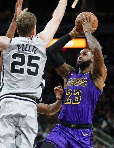 Los Angeles Lakers' LeBron James (23) shoots against San Antonio Spurs' Jakob Poeltl during the first half of an NBA basketball game Friday, Dec. 7, 2018, in San Antonio. (AP Photo/Darren Abate) The Associated Press