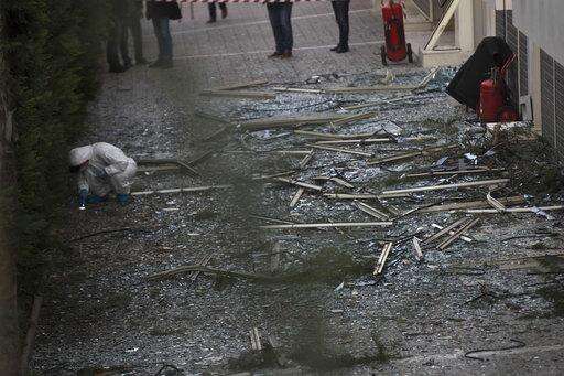 Greek forensic experts search at the scene after a powerful bomb exploded outside private Greek television station Skai, in Faliro, Athens, on Monday, Dec, 17, 2018. Police said the blast occurred outside the broadcasters' headquarters near Athens after telephoned warnings prompted authorities to evacuate the building, causing extensive damage but no injuries. (AP Photo/Petros Giannakouris)