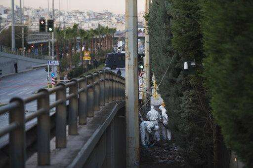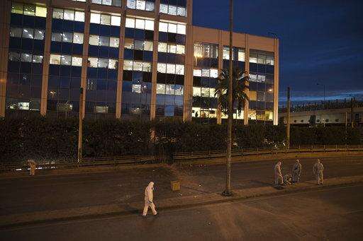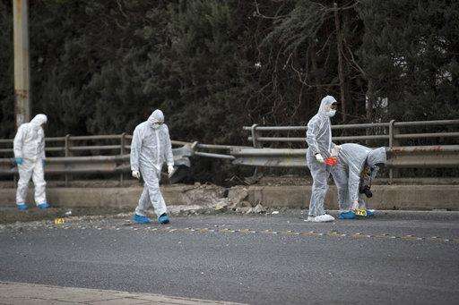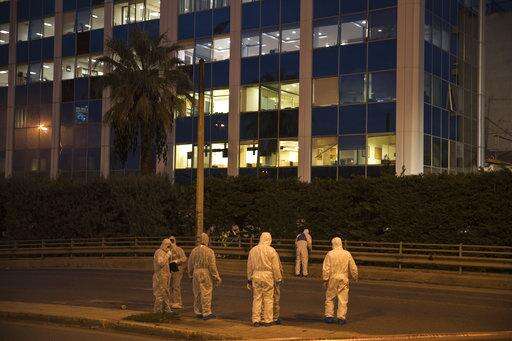 Greek forensic experts search outside the private Greek television station Skai, after a powerful bomb explosion, in Faliro, Athens, on Monday, Dec, 17, 2018. Police said the blast occurred outside the broadcasters' headquarters near Athens after telephoned warnings prompted authorities to evacuate the building, causing extensive damage but no injuries. (AP Photo/Petros Giannakouris)