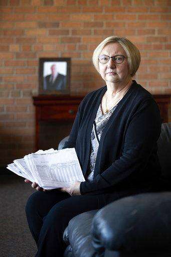 Nancy Buchholz holds her late husband Jeff's billing notices from the hospital, showing that care costs had surpassed $300,000. Jeff died six weeks after being diagnosed with cancer this spring. Nancy got Bind coverage through her employer, Dove Healthcare and the only bill she had to pay for his hospital stay was the $1,900 copayment laid out in the new insurance plan. (AP Photo/Stacy Bengs) The Associated Press