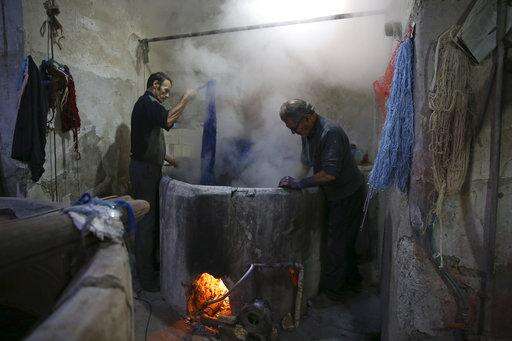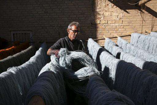 In this Monday, Dec. 10, 2018 photo, an Iranian dyer adjusts batches of thread for hand-woven carpets, that has been dyed and left to dry in the sun, at the grand bazaar in Kashan, Iran. Before the Trump administration withdrew from Iranâs nuclear deal with word powers and began restoring crippling sanctions earlier this year, the $425 million a year Persian carpet industry kept an ancient artistic tradition alive while providing much-needed income to Iranians as well as Afghan refugees, who create much of the more luxurious hand-woven pieces. (AP Photo/Vahid Salemi)