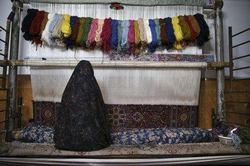 In this Monday, Dec. 10, 2018, photo, a woman weaves a Persian carpets at her home in Kashan, Iran. Before the Trump administration withdrew from Iranâs nuclear deal with word powers and began restoring crippling sanctions earlier this year, the $425 million a year Persian carpet industry kept an ancient artistic tradition alive while providing much-needed income to Iranians as well as Afghan refugees, who create much of the more luxurious hand-woven pieces. (AP Photo/Vahid Salemi)