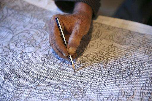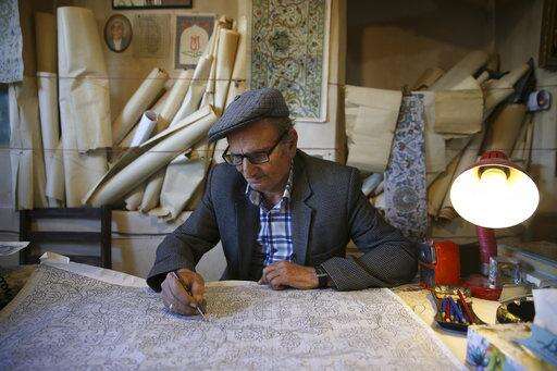 In this Monday, Dec. 10, 2018 photo, senior carpet designer, Ali Sane'ie sketches a carpet pattern in his workshop at the grand bazaar in the ancient city Kashan, Iran. As the United States works to unravel Iranâs nuclear deal with word powers, the producers of its famed Persian carpets fear they will lose vital markets. (AP Photo/Vahid Salemi)