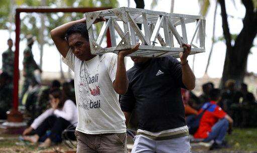 Tsunami survivor Mamat Setiadi carries part of a stage at Tanjung Lesung beach resorts Indonesia, Monday, Dec. 24, 2018. The tsunami that roared ashore in Indonesia from the Sunda Strait, killing more than 280 people and injuring over 1,000, was particularly cruel. It hit on a busy holiday weekend when many people were enjoying the warm night breeze on the beach under a full moon. And unlike most big waves, typically alerted by an earthquake's violent shaking, this was a stealth attack. (AP Photo/Achmad Ibrahim) The Associated Press