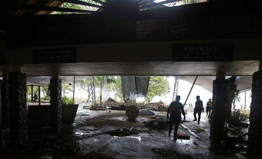 Rescueers walk around a destroyed stage at a beach resort in Tanjung Lesung, Indonesia, Monday, Dec. 24, 2018. Doctors are working to help survivors and rescuers are looking for more victims from a deadly tsunami that smashed into beachside buildings along an Indonesian strait. The waves that swept terrified people into the sea Saturday night followed an eruption on Anak Krakatau, one of the world's most infamous volcanic islands. (AP Photo/Achmad Ibrahim) The Associated Press