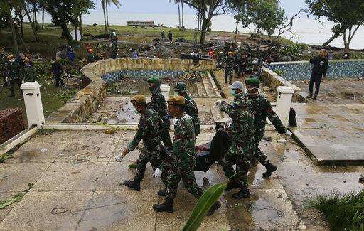 In this Monday, Dec. 24, 2018, photo, Indonesian soldiers carry the bodies of tsunami victims at a beach resort in Tanjung Lesung Indonesia. The tsunami that hit the coasts of Indonesian islands along the Sunda Strait was not big but it was destructive. The waves smashed onto beaches in the darkness Saturday night without warning, ripping houses and hotels from their foundations in seconds and sweeping terrified concertgoers into the sea. (AP Photo/Achmad Ibrahim) The Associated Press