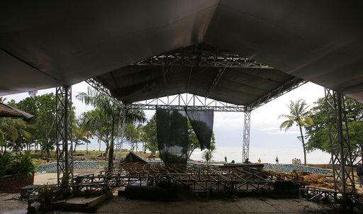 This Monday, Dec. 24, 2018, photo shows a stage destroyed by Saturday's tsunami at a beach resort in Tanjung Lesung, Indonesia. The tsunami that hit the coasts of Indonesian islands along the Sunda Strait was not big but it was destructive. The waves smashed onto beaches in the darkness Saturday night without warning, ripping houses and hotels from their foundations in seconds and sweeping terrified concertgoers into the sea. (AP Photo/Achmad Ibrahim) The Associated Press
