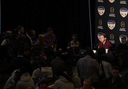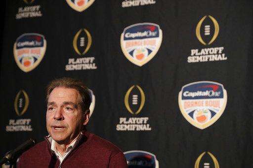 Alabama head coach Nick Saban speaks during an NCAA college football media day on Thursday, Dec. 27, 2018, in Miami Gardens, Fla. Alabama plays Oklahoma in the Orange Bowl on Dec. 29. (AP Photo/Brynn Anderson) The Associated Press