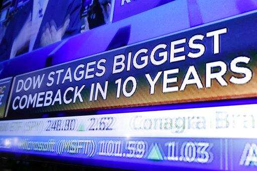 A headline on a television screen on the floor of the New York Stock Exchange tells the story, Thursday, Dec. 27, 2018. U.S. stocks staged a furious late-afternoon rally Thursday, closing with gains after erasing a 600-point drop in the Dow Jones Industrial Average. (AP Photo/Richard Drew)