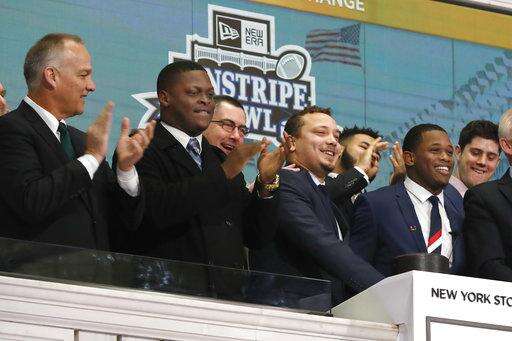 University of Wisconsin football Team Captain Alec Ingold, second from right, and University of Miami football Team Captain Jaquan Johnson, right, ring the New York Stock Exchange opening bell, Wednesday, Dec. 26, 2018. Their teams will play each other in the New Era Pinstripe Bowl, which will be played at New York's Yankee Stadium on Thursday, Dec. 27, 2018. (AP Photo/Richard Drew)