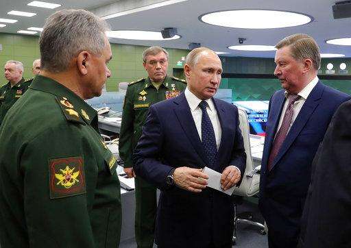 Russian Defense Minister Sergei Shoigu, left, Russian President Vladimir Putin, center, Chief of General Staff of Russia Valery Gerasimov, background center, and special representative on questions of ecology and transport, Sergei Ivanov, right, talk to each other as they come to oversee the test launch of the Avangard hypersonic glide vehicle from the Defense Ministry's control room in Moscow, Russia, Wednesday, Dec. 26, 2018. In the test, the Avangard was launched from the Dombarovskiy missile base in the southern Ural Mountains. The Kremlin says it successfully hit a designated practice target on the Kura shooting range on Kamchatka, 6,000 kilometers (3,700 miles) away. (Mikhail Klimentyev, Sputnik, Kremlin Pool Photo via AP)