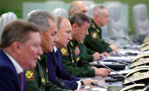 Russian President Vladimir Putin, left, and Chief of General Staff of Russia Valery Gerasimov oversee the test launch of the Avangard hypersonic glide vehicle from the Defense Ministry's control room in Moscow, Russia, Wednesday, Dec. 26, 2018. In the test, the Avangard was launched from the Dombarovskiy missile base in the southern Ural Mountains. The Kremlin says it successfully hit a designated practice target on the Kura shooting range on Kamchatka, 6,000 kilometers (3,700 miles) away. (Mikhail Klimentyev, Sputnik, Kremlin Pool Photo via AP)