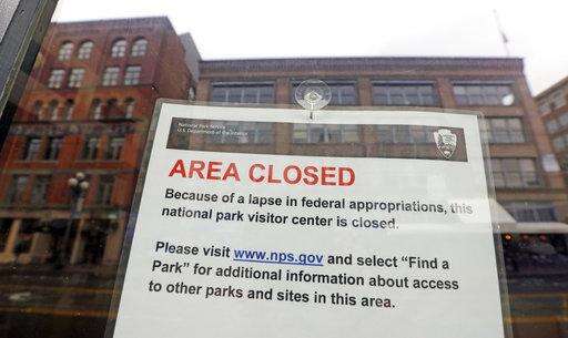 The tiny Klondike Gold Rush National Historical Park in Seattle's historic Pioneer Square neighborhood is posted with a closed sign as part of the federal government shutdown Wednesday, Dec. 26, 2018. The shutdown started Saturday when funding lapsed for nine Cabinet-level departments and dozens of agencies. (AP Photo/Elaine Thompson) The Associated Press