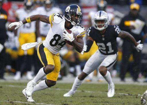 File-This Dec. 9, 218, file photo shows Pittsburgh Steelers wide receiver Antonio Brown (84) running against Oakland Raiders cornerback Gareon Conley (21) during the second half of an NFL football game in Oakland, Calif. Brown is modifying his jersey, using a marker to add an “s” to the end of his last name. Safety Sean Davis is mulling a present or two to Cleveland quarterback Baker Mayfield, promising to send the rookie “a little something something” if the Browns can beat the Baltimore Ravens on Sunday and open the door for the Steelers to win a third straight AFC North title. (AP Photo/D. Ross Cameron, File) The Associated Press
