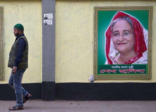 A man walks past a portrait of Bangladesh Prime Minister Sheikh Hasina on the eve of general elections in Dhaka, Bangladesh, Saturday, Dec. 29, 2018. As Bangladeshis get set for Sunday's parliamentary elections, there are fears that violence and intimidation could keep many away from the polls, including two opposition candidates who said police had barricaded them inside their homes. (AP Photo/Anupam Nath) The Associated Press