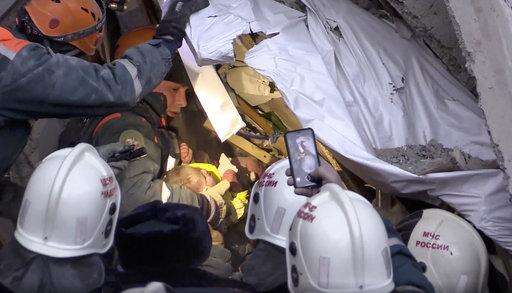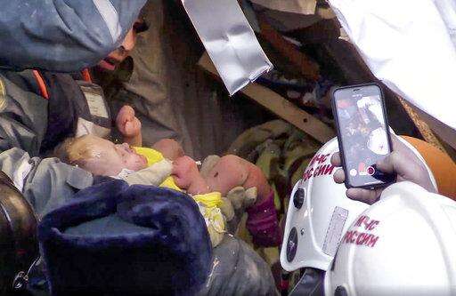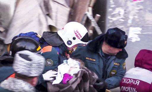 This photo provided by the Russian Emergency Situations Ministry taken from tv footage shows Emergency Situations employees save a 10 month old baby at the scene of a collapsed section of an apartment building, in Magnitigorsk, a city of 400,000 about 1,400 kilometers (870 miles) southeast of Moscow, Russia, Tuesday, Jan. 1, 2019. Rescue crews on Tuesday temporarily halted their search through the rubble in the city of Magnitogorsk while workers tried to remove or stabilize sections of the building in danger of collapse. (Russian Ministry for Emergency Situations photo via AP)