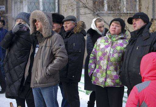 People look at the scene of a collapsed apartment building in Magnitogorsk, a city of 400,000 people, about 1,400 kilometers (870 miles) southeast of Moscow, Russia, Tuesday, Jan. 1, 2019. Rescue crews on Tuesday temporarily halted their search through the rubble in the city of Magnitogorsk while workers tried to remove or stabilize sections of the building in danger of collapse. (AP Photo/Maxim Shmakov)