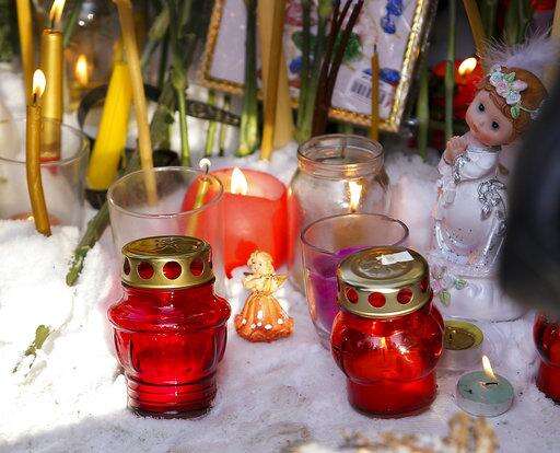 Toys, candles and flowers lie at the scene of a collapsed apartment building in Magnitogorsk, a city of 400,000 people, about 1,400 kilometers (870 miles) southeast of Moscow, Russia, Tuesday, Jan. 1, 2019. Rescue crews on Tuesday temporarily halted their search through the rubble in the city of Magnitogorsk while workers tried to remove or stabilize sections of the building in danger of collapse. (AP Photo/Maxim Shmakov)