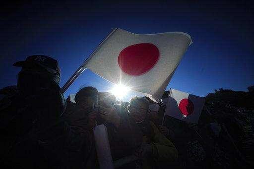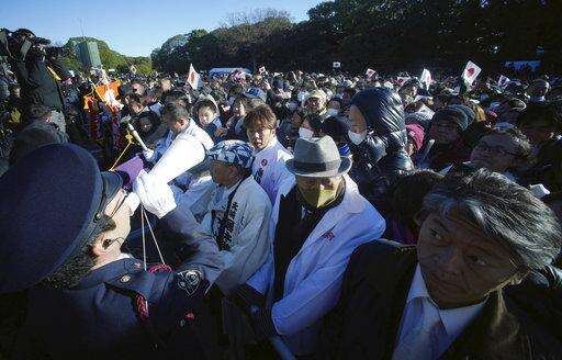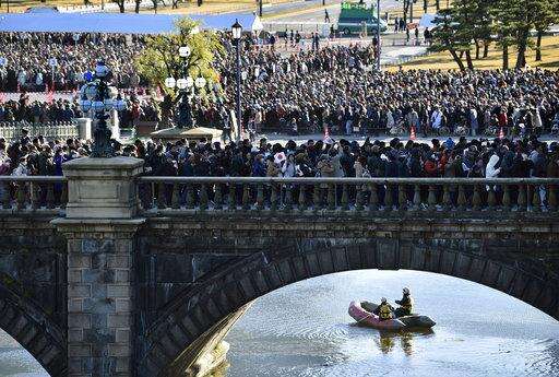 Well-wishers wait for Japan's Emperor Akihito's public appearance with his family members at Imperial Palace during his New Year's public appearance with his family members at Imperial Palace in Tokyo Wednesday, Jan. 2, 2019. (AP Photo/Eugene Hoshiko)
