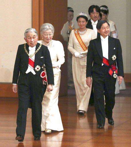 Japanese Emperor Akihito, left, and Empress Michiko, second from left, Crown Prince Naruhito, right, and Crown Princess Masako, second from right, arrive for an imperial ceremony in the celebration of New Year at the Imperial Palace in Tokyo, Tuesday. Jan. 1, 2019. (Kyodo News via AP)
