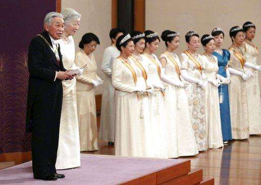 Japanese Emperor Akihito, left, accompanied by Empress Michiko, second from left, delivers a speech during an imperial ceremony in the celebration of New Year at the Imperial Palace in Tokyo, Tuesday. Jan. 1, 2019. (Kyodo News via AP)