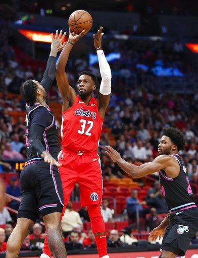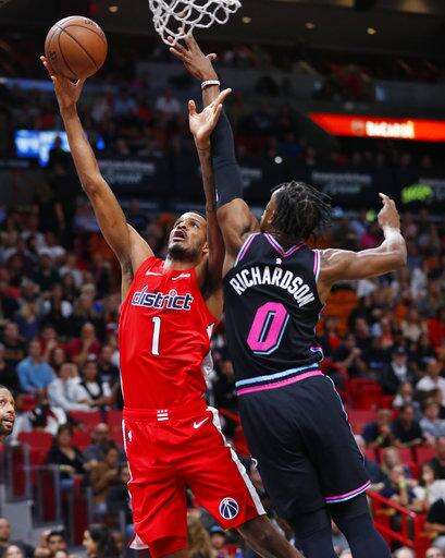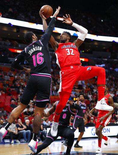 Wizards: Washington missed tip-ins to close each of the first two quarters. ... Markieff Morris, who will miss the next 6-8 weeks with a neck issue, was on the court pregame getting in some very light non-contact work alongside Wizards assistant coach Kristi Toliver. ... John Wall, who has made Miami an offseason base in recent years, was on the Wizards' bench. He'll have season-ending surgery on his left heel in the coming days.