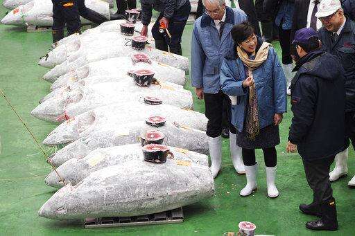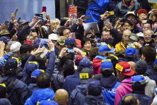 Tokyo Gov. Yuriko Koike, center, observes as prospective buyers bid on fresh tunas during the first auction of the year at the newly opened Toyosu Market, new site of Tokyo's fish market, Saturday, Jan. 5, 2019. (AP Photo/Eugene Hoshiko)