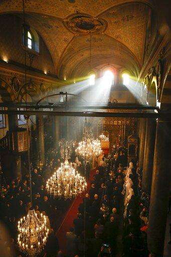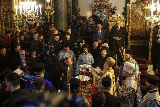 People and Orthodox priests attend a religion service at the Patriarchal Church of St. George in Istanbul, Sunday, Jan. 6, 2019. An independent Ukrainian Orthodox church has been created at a signing ceremony in Turkey, formalizing a split with the Russian church it had been tied to since 1686. (AP Photo/Lefteris Pitarakis) The Associated Press