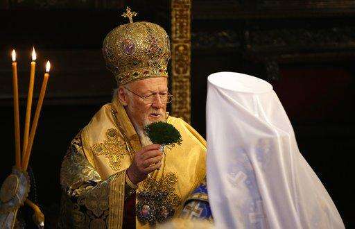 Ecumenical Patriarch Bartholomew I, center right, blesses a priest, center left, as Metropolitan Epiphanius, the head of the independent Ukrainian Orthodox Church, right of him, looks on at the Patriarchal Church of St. George in Istanbul, Sunday, Jan. 6, 2019. An independent Ukrainian Orthodox church has been created at a signing ceremony in Turkey, formalizing a split with the Russian church it had been tied to since 1686. (AP Photo/Lefteris Pitarakis) The Associated Press