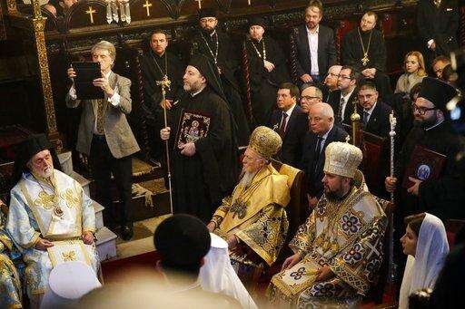Ecumenical Patriarch Bartholomew I, third right, and Metropolitan Epiphanius, the head of the independent Ukrainian Orthodox Church, second right, attend a religion service at the Patriarchal Church of St. George in Istanbul, Sunday, Jan. 6, 2019. An independent Ukrainian Orthodox church has been created at a signing ceremony in Turkey, formalizing a split with the Russian church it had been tied to since 1686. (AP Photo/Lefteris Pitarakis) The Associated Press