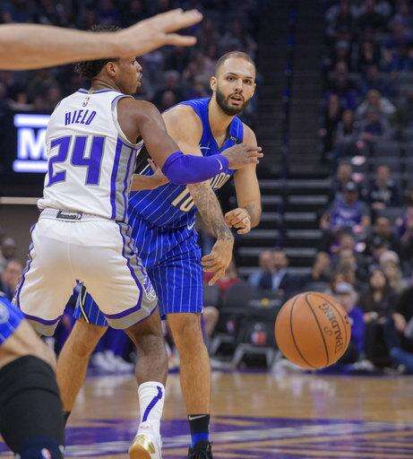 Orlando Magic guard Evan Fournier (10) passes the ball past Sacramento Kings guard Buddy Hield (24) during the first quarter of an NBA basketball game in Sacramento, Calif., Monday, Jan. 7, 2019. (AP Photo/Randall Benton) The Associated Press