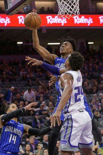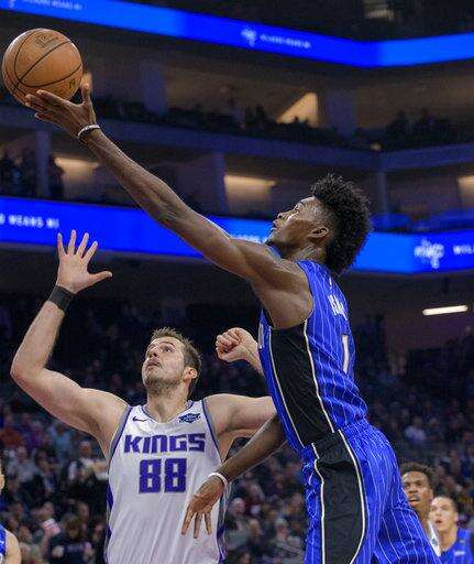 Orlando Magic forward Jonathan Isaac (1) lays the ball up over Sacramento Kings forward Nemanja Bjelica (88) during the first quarter of an NBA basketball game in Sacramento, Calif., Monday, Jan. 7, 2019. (AP Photo/Randall Benton) The Associated Press