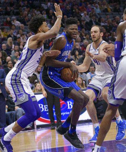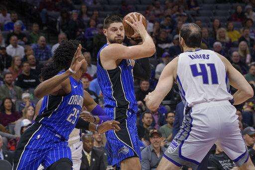 Orlando Magic center Nikola Vucevic, center, prepares to pass the ball as Sacramento Kings center Kosta Koufos, right, defends during the first quarter of an NBA basketball game in Sacramento, Calif., Monday, Jan. 7, 2019. (AP Photo/Randall Benton) The Associated Press