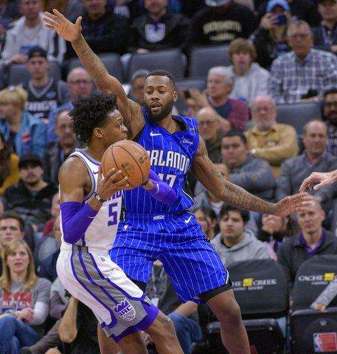 Orlando Magic forward Jonathon Simmons (17) defends against Sacramento Kings guard De'Aaron Fox (5) during the first quarter of an NBA basketball game in Sacramento, Calif., Monday, Jan. 7, 2019. (AP Photo/Randall Benton) The Associated Press