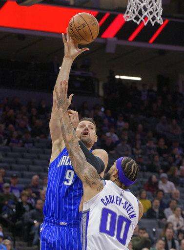 Orlando Magic center Nikola Vucevic (9) shoots over Sacramento Kings center Willie Cauley-Stein (00) during the first quarter of an NBA basketball game in Sacramento, Calif., Monday, Jan. 7, 2019. (AP Photo/Randall Benton) The Associated Press