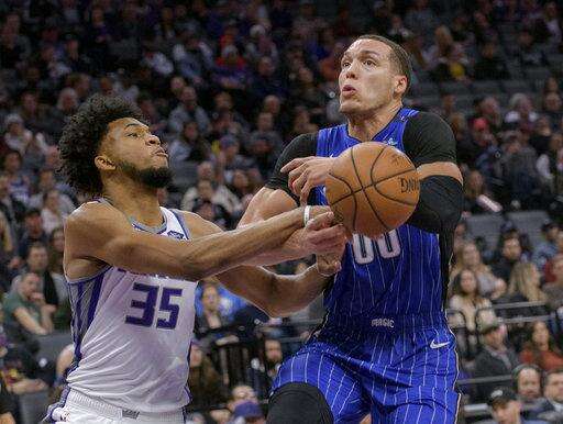 Sacramento Kings forward Marvin Bagley III (35) fouls Orlando Magic forward Aaron Gordon (00) during the first quarter of an NBA basketball game in Sacramento, Calif., Monday, Jan. 7, 2019. (AP Photo/Randall Benton) The Associated Press