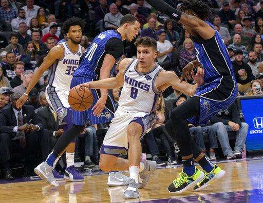 Sacramento Kings guard Bogdan Bogdanovic (8) works past Orlando Magic forward Wesley Iwundu, right, during the second half of an NBA basketball game in Sacramento, Calif., Monday, Jan. 7, 2019. The Kings won 111-95. (AP Photo/Randall Benton) The Associated Press