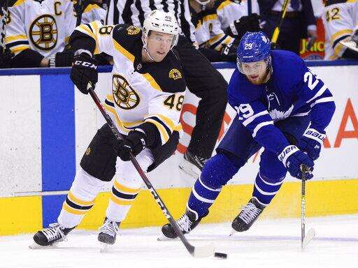 Boston Bruins defenseman Matt Grzelcyk (48) carries the puck past Toronto Maple Leafs right wing William Nylander (29) during the first period of an NHL hockey game, Saturday, Jan. 12, 2019 in Toronto. (Frank Gunn/The Canadian Press via AP) The Associated Press