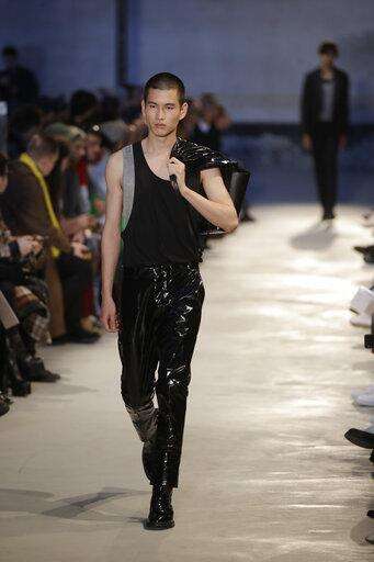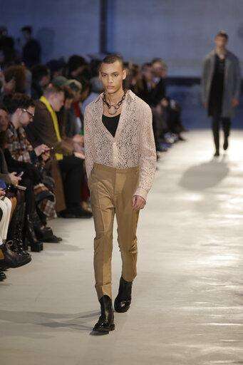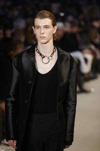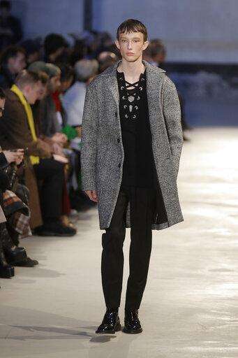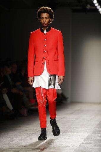 A model wears a creation as part of the N.21 men's Fall-Winter 2019-20 collection, that was presented in Milan, Italy, Monday, Jan.14, 2019. (AP Photo/Luca Bruno)
